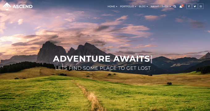Inspiro is a free theme suitable for personal WordPress websites and adventure and travel blogs. It features a background image at the top with bold welcome text and a call-to-action button.